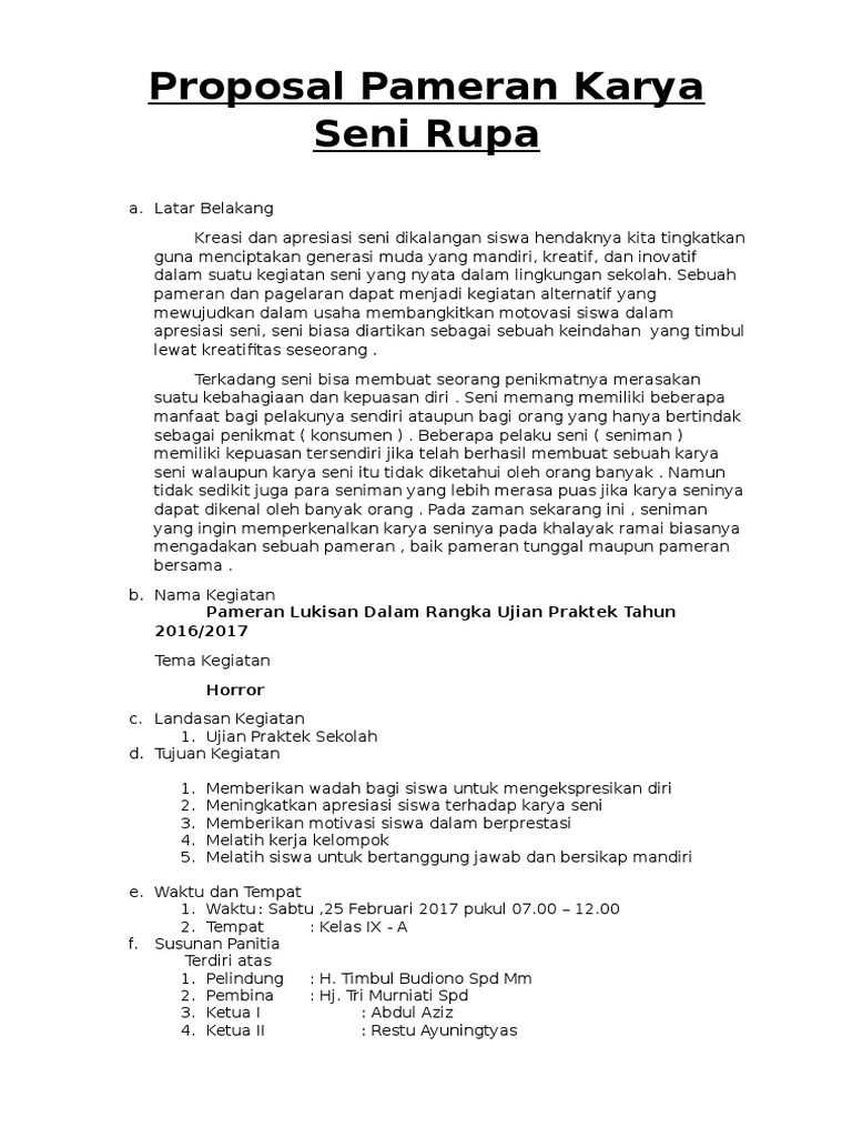 Doc Proposal Kegiatan Pameran Seni Lukis Dimas Alfarizi Academia Edu from 0.academia-photos.com Proposal lazimnya dikenal sebagai sebuah dokumen yang berisi rencana kegiatan yang terancang secara sistematis dan terperinci. Latar belakang contoh proposal pameran seni rupa di sekolah seni rupa adalah cabang seni yang membentuk karya seni dengan media yang bisa ditangkap mata. Mengenai materi tentang perencanaan pameran seni rupa kelas 12 sma/ma. Materi ini juga dilengkapi dengan latihan soal serta pembahasan. Selain itu, proposal digunakan untuk mencari dana dari berbagai pihak (sponsorship) untuk membantu kelancaran penyelenggaraan pameran. Memberi dorongan agar siswa mempunyai keterkaitan terhadap pelajaran mulok khususnya tata boga. Kegiatan pameran seni rupa yang akan terkadang, seni bisa membuat seorang penikmatnya merasakan suatu kebahagiaan dan saya sangat berharap pameran ini dapat menjadi contoh yang baik bagi adik maupun kakak kelas. Proposal kegiatan kampus pameran buku karya mahasiswa.